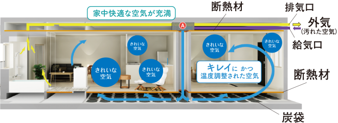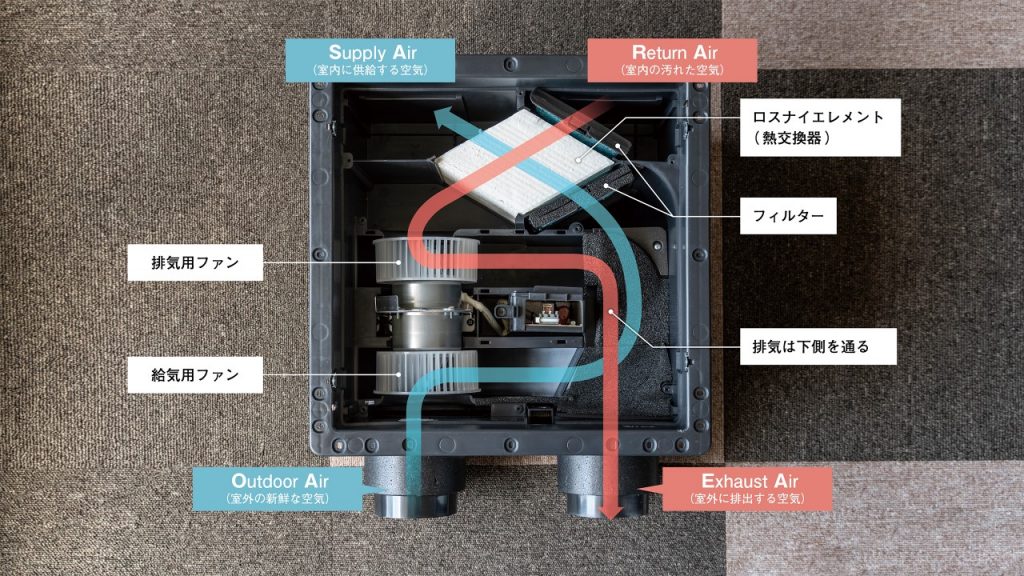 この仕組みによって、室内と外の温度差をできるだけ抑えながら換気をすることができます。