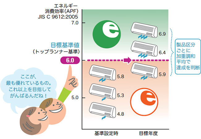 この制度は、市場の中で最も省エネ性能の高い製品を基準にして、それ以上の性能を目指す仕組みです。