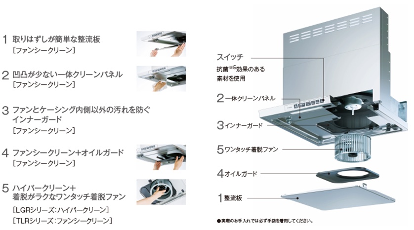 富士工業の換気扇は、毎日のお手入れをできるだけ簡単にできるように工夫されたつくりになっています。