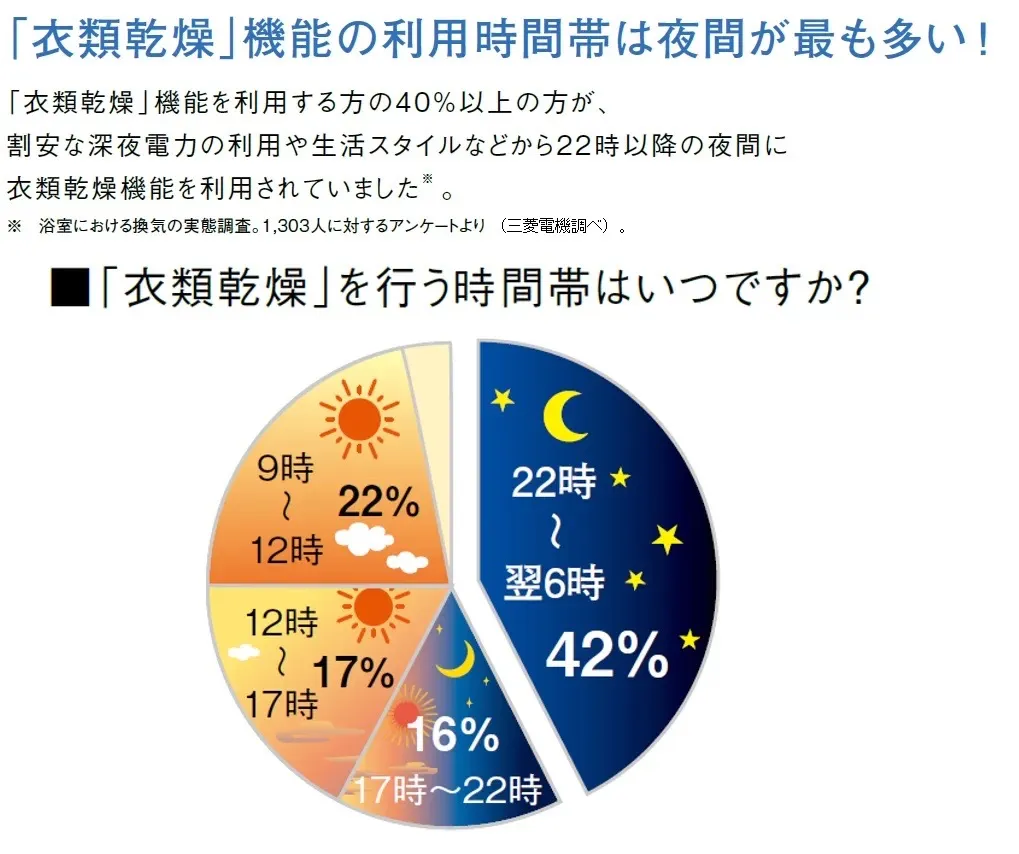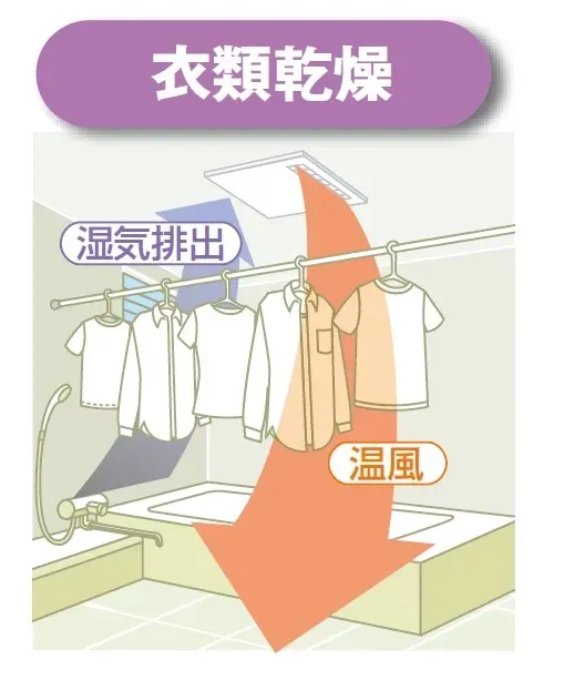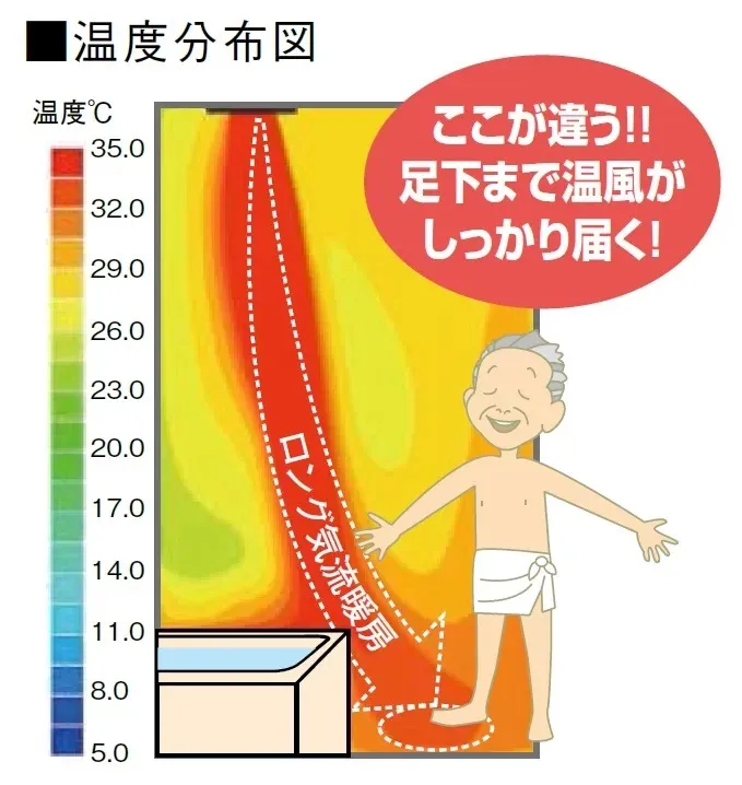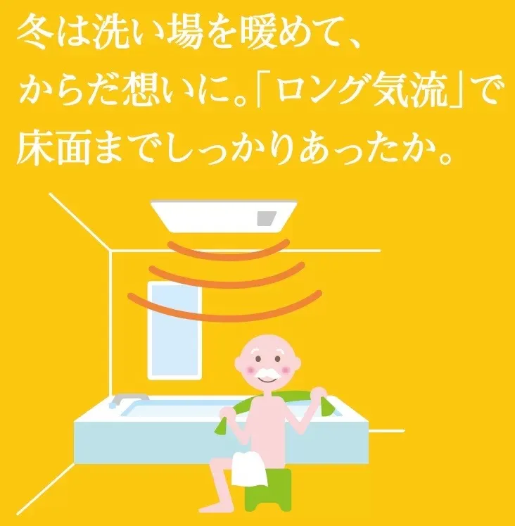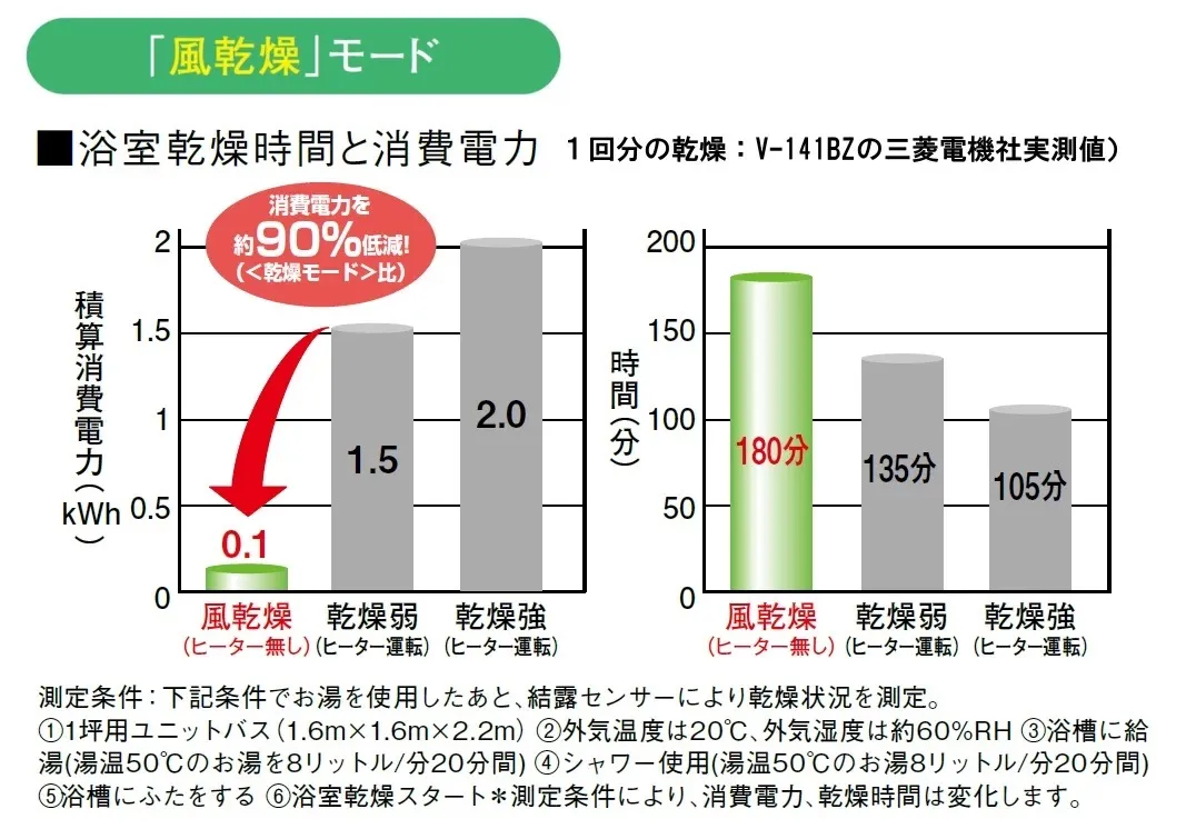 乾燥時間は長めになりますが、循環風と換気風の風量バランスを制御することで、ヒーターなしでも効果的に浴室を乾かせます。